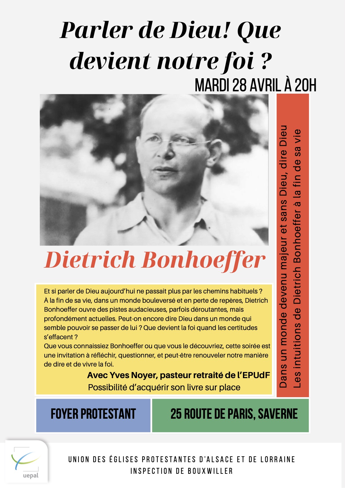 PÂQUESEn cliquant sur ce lien vous pouvez télécharger la liturgie de Pâques, proposée par l’UEPAL. Cet autre lien vous mène vers le site de l’UEPAL qui recense un bon nombre de possibilités. Et enfin, ce lien vous permet de lire le message œcuménique de Pâques de Monseigneur Luc Ravel, archevêque de Strasbourg, et de Christian Albecker, président de l’UEPAL